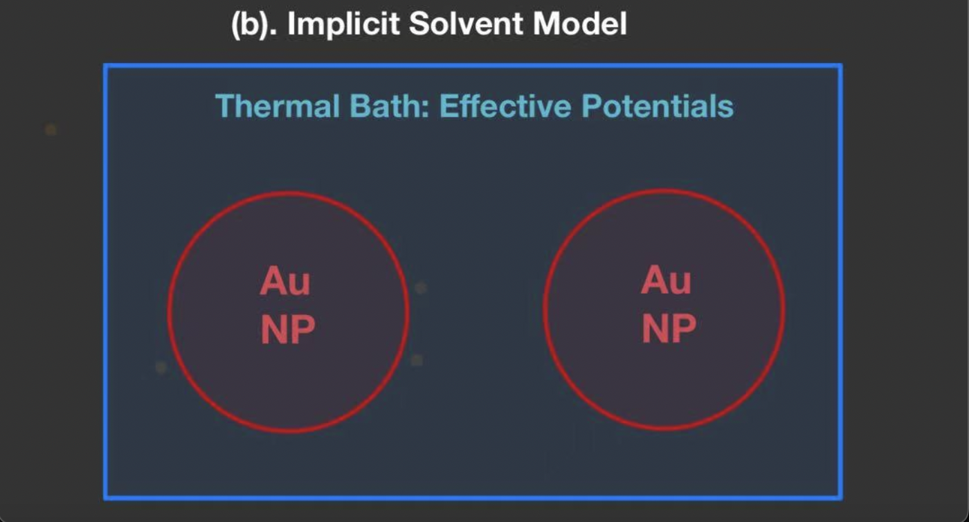 An implicit solvent model treats solvent molecules as a “bath”, which transfers the molecular interactions to averaged, continuum effects with the frictional drag and stochastic force.
